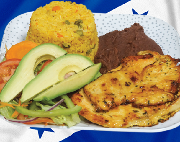 PECHUGA A LA PLANCHA Con arroz, frijoles, ensalada y aguacate Grilled chicken breast: W/ rice beans, salad & avocado