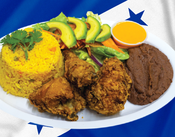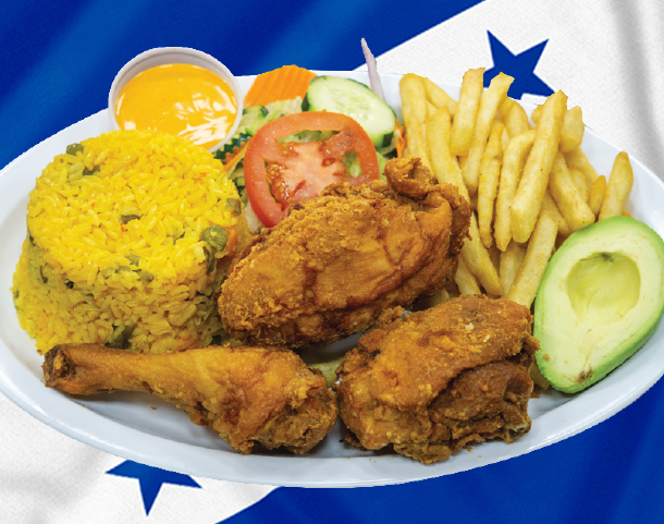 POLLO FRITO Arroz, papas fritas y ensalada Fried chicken: W/ rice, beans, french fries & salad