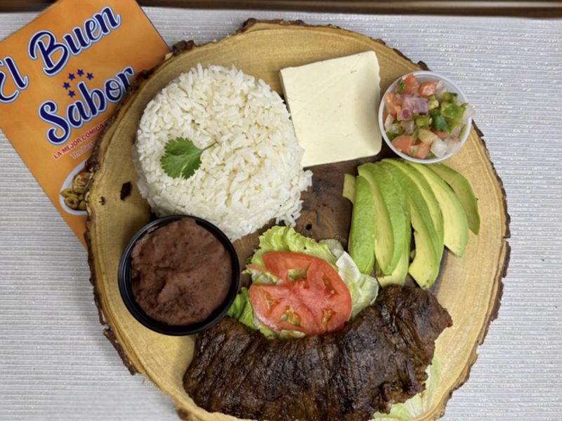 BANDEJA TIPICA SALVADOREÑA Carne asada, arroz,chorizo frijoles enteros, huevo estrellado, aguacate, chimol, queso y platano Salvadorean Typical Dish: Grill steak w/ rice, spanish sausage, beans, scaramble, egg, sausage, avocado, pico de gallo, cheese & sweet plantain