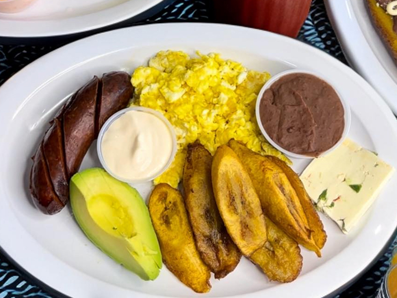 Platano maduro, salchicha, aguacate, frijol frito, queso y crema Breakfast w/ scrambled eggs