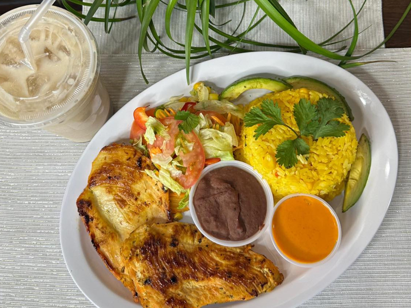 PECHUGA A LA PLANCHA Con arroz, frijoles, ensalada y aguacate Grilled chicken breast: W/ rice beans, salad & avocado